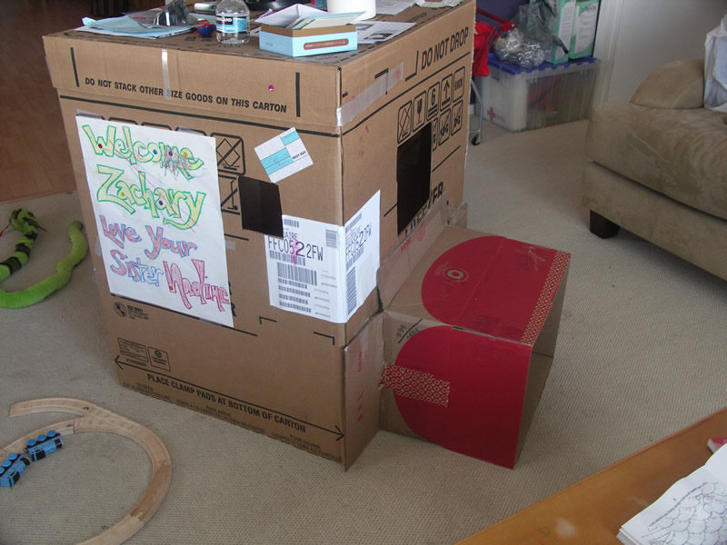 One day when Beth was over, she thouht the house needed an addition, so instead of breaking down a target box for recycling, she taped it to the side of the house so that it could be another means of egress. Chang could also use it. Dad sometimes tries to crawl in, too.